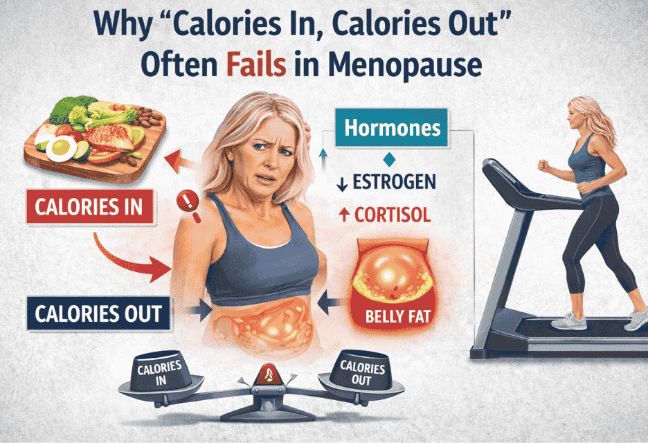 This hormonal environment works against weight loss and explains why calories in, calories out often fails for menopausal women.
